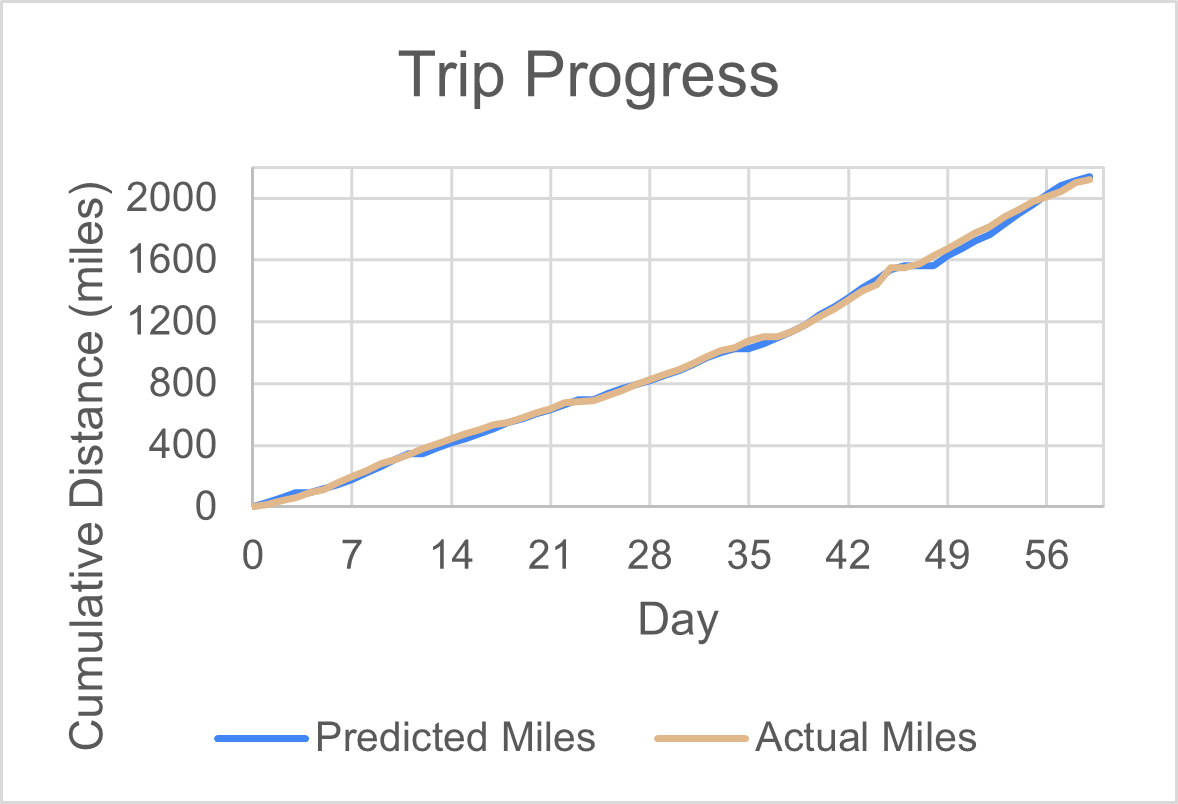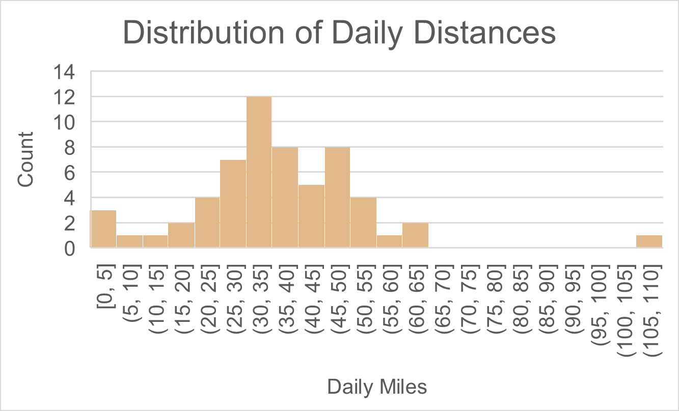 Ignoring outliers like zero days and 100 mile day, our mileage basically fell into 3 categories: