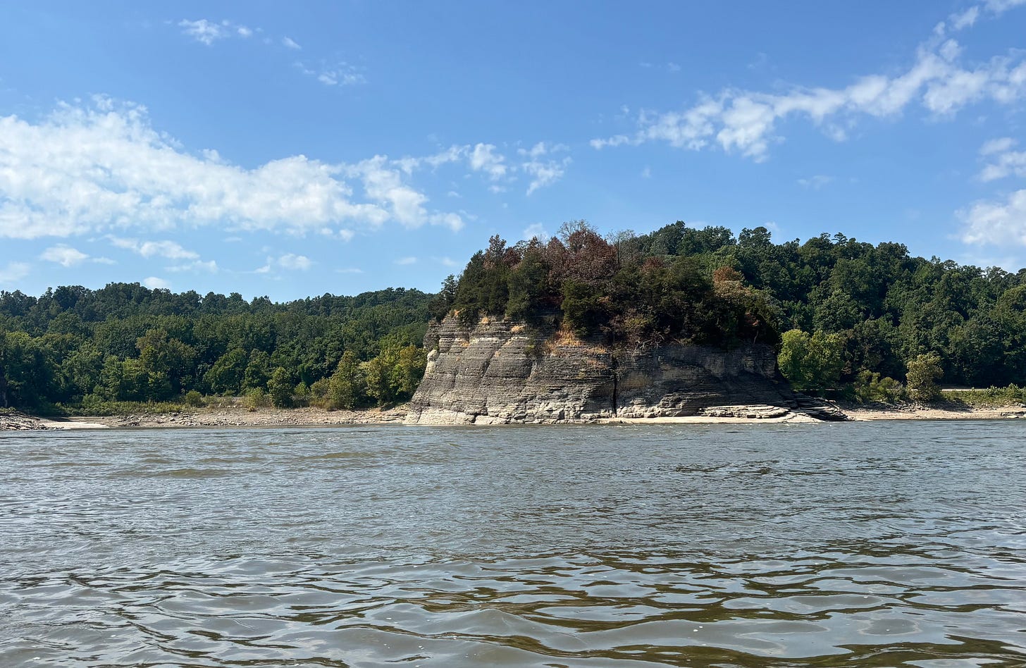 On the 41st day of the trip, we woke up at a muddy campsite and began paddling. Soon after, we met fellow source-to-sea adventurer Russell and his unnamed canine companion. They let us know that beaver tastes like rib-eye. We visited briefly before carrying on to the Wittenberg Boat Club at mile marker 88. The ramp and accompanying picnic space were immaculate. Three of the club members happened to be hanging out that morning. They shared local lore and tidbits about the surrounding area, including a site-to-see called “Tower Rock.” Though I wanted to stop to try to scale the cliff, we were on a deadline and have a general policy of choosing safety over adventure.