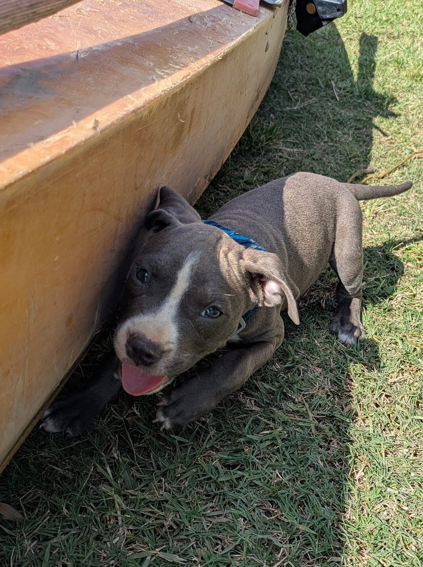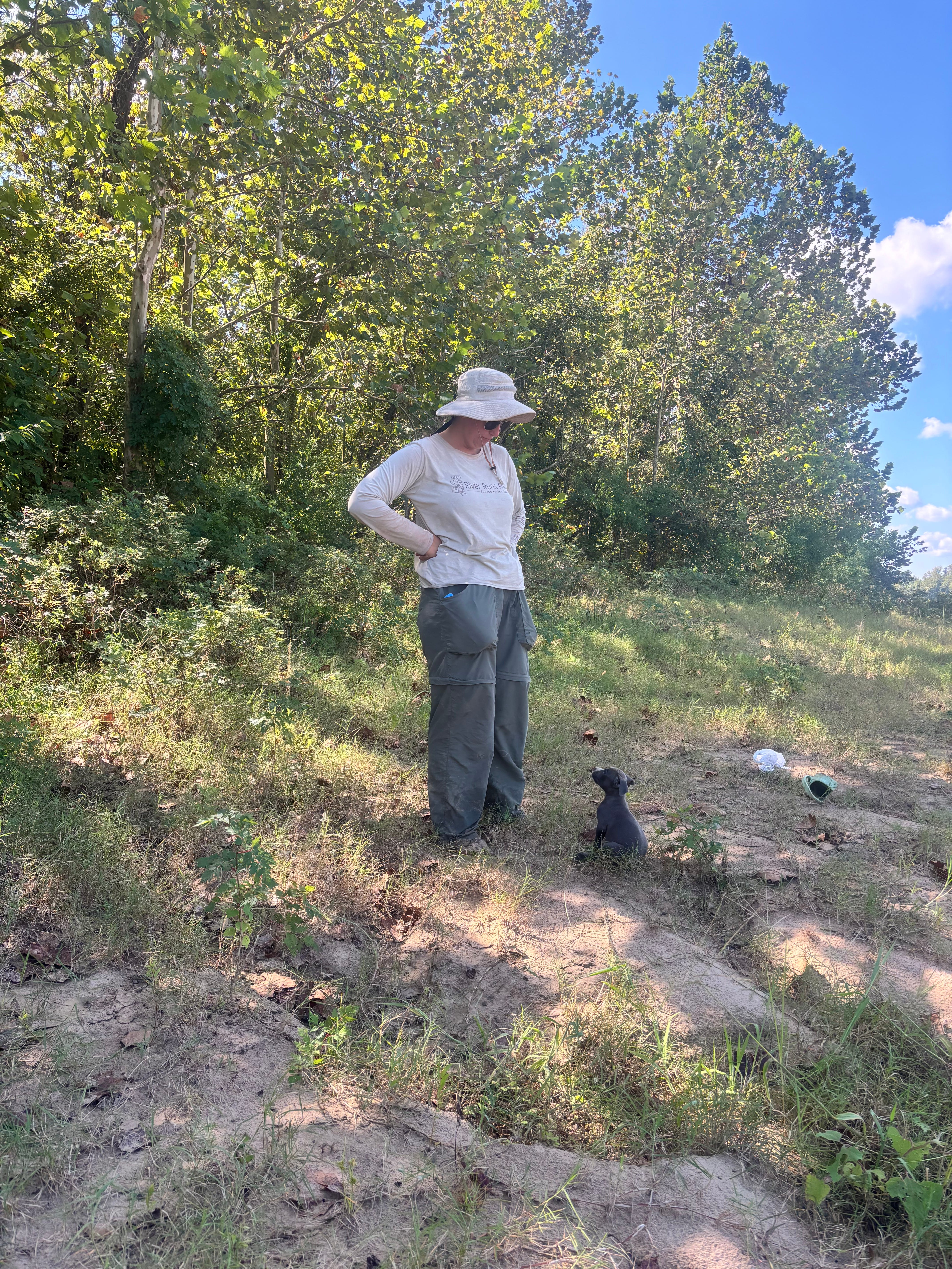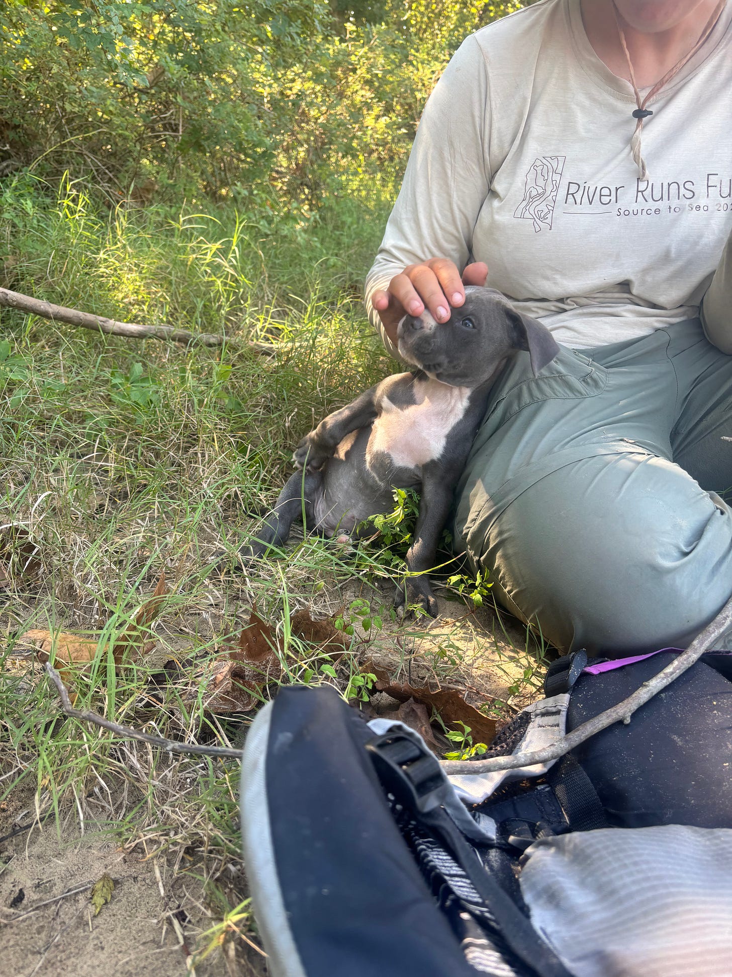 We picked her up at the Melville boat ramp, where we stopped to toss trash. I couldn't find a public trash can, so I asked the residents of a nearby camper where to find one. They weren’t sure, but generously let me come into their campsite to deposit our overflowing bags in their private can. While I walked across their site, a pack of puppies materialized at my heels. When I bent down to pet the bravest of the bunch, the campers ask if I wanted one (you can see where this is going, but you’re wrong). Remembering my promise to my husband to never come home with another living being unannounced, I (politely and responsibly) said no. However, I never promised not to cajole my friends into doing so!
