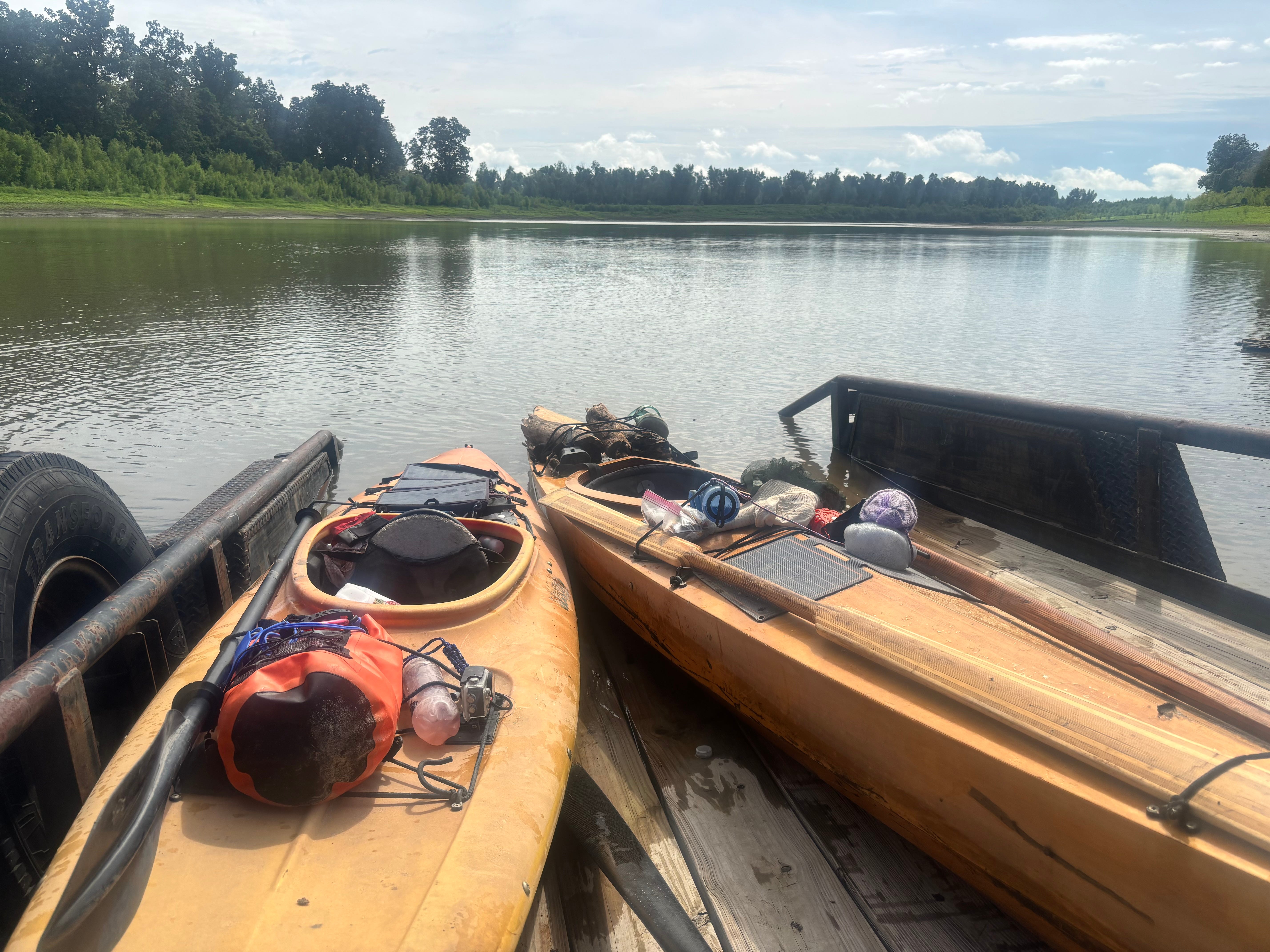We decided to have lunch while we waited and choose whichever option materialized first, which turned out to be the portage. This was my favorite portage of the entire trip. The men backed their trailer into the water and we paddled right on, just like a real boat! They drove us around and we slid off again, never having to remove our bags from boats. Portaging in style!