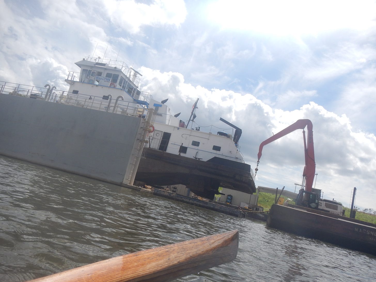 On the other side of the dam, we saw where we would’ve paddled (low, muddy, and likely requiring a manual portage) had we not waited, and then we started the canal to the Atch. Along the canal, we saw several salvage tugs and boxes, including one being actively torn apart in a dry dock. One of the salvage workers offered us water and gave navigational advice. As we exited the canal, Leah saw three gators. I was not amused, but the Atch itself was really pretty.